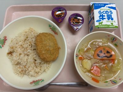 【ハッピーハロウィン♪】 ★バターライス ★牛乳 ★ハロウィンスープ ★かぼちゃコロッケ ★ハロウィンゼリー