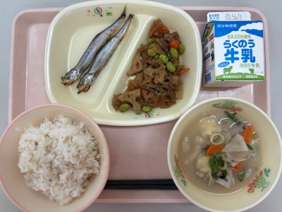 ★麦ごはん ★牛乳 ★すき焼き風煮 ★トマトオムレツ ★こんぶ和え