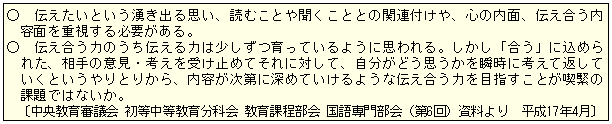| 中央教育審議会初等中等教育分科会(国語専門部会)では、国語教育の現状や課題について審議され、「話すこと・聞くこと」に関する教育内容の在り方では、以下のように「伝え合う力」の育成が課題にされている。 |