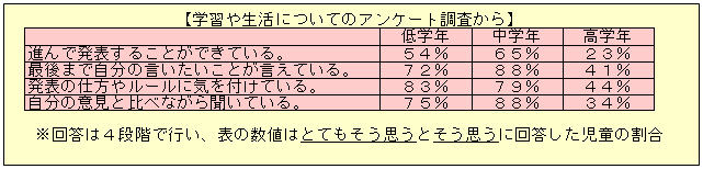 低学年や中学年では意欲的に発表等に取り組めている一方、高学年では話すことや発表することに苦手意識をもつようになってきている。このことから、低学年の段階から系統的に伝え合う力の育成を図れば、高学年の段階でも抵抗感なく進んで伝え合う活動に取り組むことができるようになると考える。 |