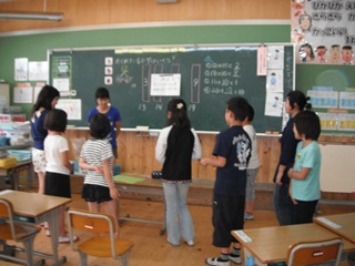 ■本校では、この2年間、地域や関係機関の協力を得て4年生を対象にした草原学習を行っています。草原学習は、草泊り作り、乗馬体験、阿蘇登山等々、草原に関わる活動が中心です。子どもたちは、自分たちで作った草泊りで寝泊りしながら、活動を通してたくさんの生きる知恵を学びます。■6月29日(月)、この学習の最大の協力者である内牧1区の有志の皆さんにお越しいただき、第1回目の打ち合わせ会を行いました。今年も昨年同様の活動ができることになりうれしく思います。実施期間は、10月6日(火)から10月8日(木)です。 ※写真は昨年度のものです。左が草泊り作りの様子、右が乗馬体験の様子
