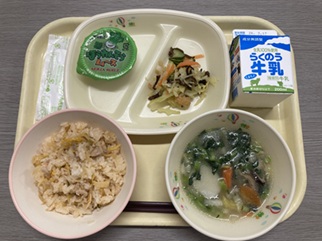 中学3年生のリクエスト給食「キムたくごはん・ほうれん草ムース」です!